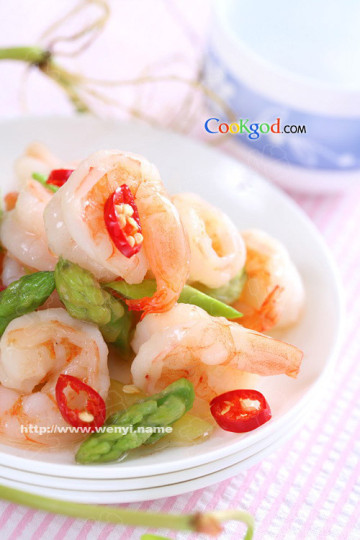 鲜虾仁300克、芦笋(或青椒)200克、盐1茶匙(5克)、淀粉2茶匙(10克)、料酒1汤匙(15ml)、葱1段、姜5片