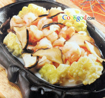 2、烤盘底部浇上一层奶油沙司,把大虾仁放在上面,菜花摆放周围,上面撒鲜菇片。