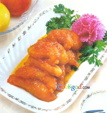 色泽红亮,酥脆细嫩,酸甜可口。