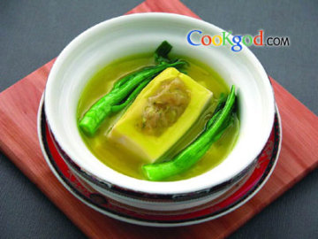 石蛤(又叫虎纹蛙,肉质细嫩,口味清新,目前已有人工养殖,可用牛蛙代替)200克,盒装山水豆腐(即内脂豆腐)400克,芥兰50克。调料黄烩汁600克,湿淀粉15克,蛋清10克,盐、味精、生粉各5克。