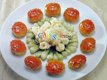2、虾仁治净,入油锅滑炒至熟,放入围好的菜胆中,炸好的蟹斗围边摆放即成。