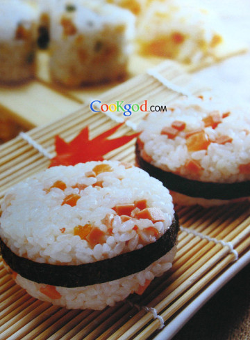 3、拌匀后放入模具中压成大小适中的饭团即可(食用时可佐以芥末、日本酱油)。