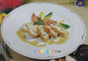 (6)将鸡肉卷斜切成厚片,配上蔬菜和基尾虾,淋上奶油明虾汁。