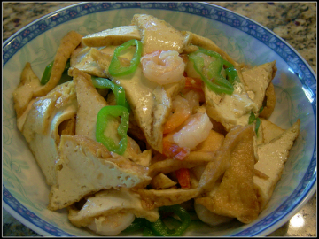 3,余油入蒜末稍稍爆香,入油豆腐和青椒炒,最后入虾仁翻炒;