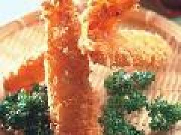 2:将青虾拍面粉,托蛋液,沾面包糠下入4成热油中炸熟