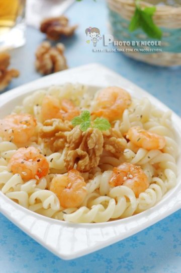 主料:螺丝通心粉100g、煮熟的虾仁8个、核桃仁20g