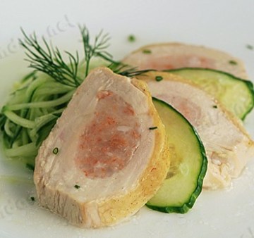 4) 酿好虾胶的鸡胸放入蒸锅,大火蒸25分钟。切1cm厚的片;
