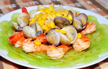 7:锅烧热放黄油 待黄油化开 放玉米粒炒香后放蛤蜊和虾 放盐改小火上盖子 五分钟后出锅摆盘