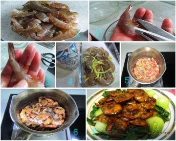 2、虾身用剪刀去掉虾线,用料酒、生姜、盐淹制10分钟,锅烧热爆炒虾身,加生抽烧一会后,加啤酒,没过虾,烧到收汁。