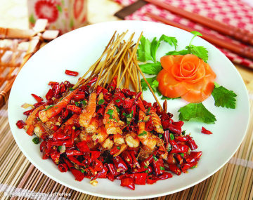 调料:粗粒盐500克,竹签30支,大红椒、洋葱各10克,味椒盐、味精、白糖、海鲜汁、红油、香油各5克,葱、大蒜瓣、姜各8克,植物油2500克(实耗50克),二汤80克。
