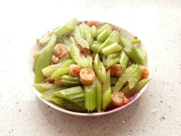 4.下芹菜翻炒,加入虾仁,大火快炒,加盐,鸡粉调味,即成。