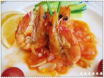 6.酱汁制作;1 ,放橄榄油,6成热时把蒜蓉,洋葱碎放入煸炒.2.放入番茄煸炒.3.放入百合,放入番茄酱,煮10分钟.4.大虾排放碟上,淋上酱汁.(配上果蔬)