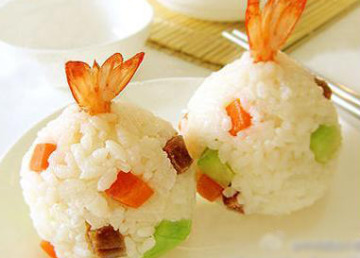 1将鸡蛋打成蛋液,加葱头末、盐、胡椒粉、柠檬汁一同混合均匀制成塔塔酱 2将大虾去头、壳及肠线,在腹部划斜刀,然后翻身按压虾背,拉长拉直,撒上少许盐、胡椒粉,裹上面粉蛋液面包粉,下入五成热的油锅炸酥3将炸好的虾抹上塔塔酱,包入寿司饭中捏成饭团,贴上海苔条。太有爱啦~