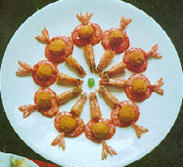 5、摆盘:用洁白圆盘,将虾头朝盘心围摆成圆形,虾身两片对称成扁圆形,每个对接虾头,再将虾尾联上,炸虾丸放在虾身围圈内。盘中心放置西红柿雕成的花朵衬托即成。