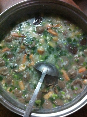 四:待粥煮开了,把洗净的材料全部扔下去,虾可以不要这么早放.早放煮久了.虾会硬.