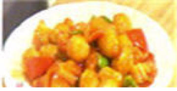 4、炒锅上火,加底油、糖、白醋、番茄酱、胡椒粉、菠萝汁、洋葱、青椒、红椒、菠萝块,勾芡加入炸好的虾球,淋少许明油即可。