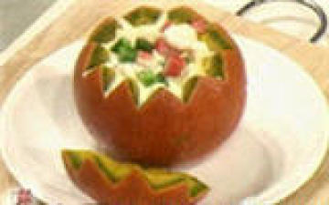 2、取一器皿放入蛋清、适量牛奶、花奶拌匀,倒入南瓜里,放入虾仁、豆腐放到蒸锅中蒸20分钟取出,放入蚧柳、芥兰粒再蒸3分钟出锅即可。