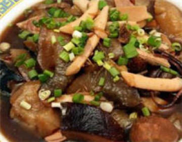 主料:海参(水浸)150克、鸡肉100克、冬笋100克、香菇(鲜)100克