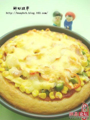 4.面团擀成烤盘大小.放入已抹油的烤盘.用手推成中间薄四周厚的面饼.扎几个小洞(厚面饼就不用扎)在面饼边的四周抹一层橄榄油.放入馅料.顺序是从底层起:奶酪----肉.菜---玉米---黑橄榄---奶酪.