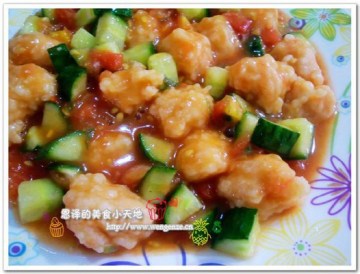 鲜虾仁,番茄,黄瓜,白糖,精盐,葱花,姜片,淀粉