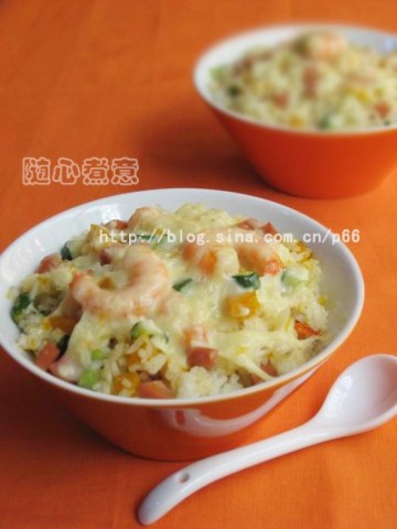 3.将炒好的米饭盛入碗中,撒上乳酪丝,放进预热180度的烤箱烤约5分钟,至表面金黄即可