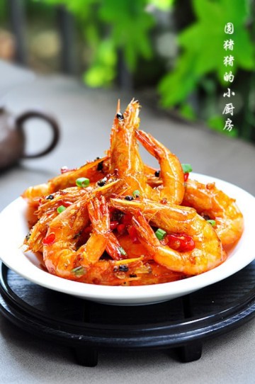 5.将炸好的虾放入锅内。7.放入所有调味料。8.翻炒至收净汁即可