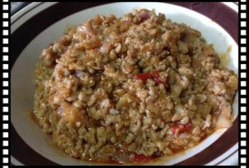 2、猪肉碎还未下锅前加入少许清水(大概2大匙)搅拌均匀,再下锅和虾米菜脯一起炒。(如果没有加水,肉碎下到锅里不会散开)