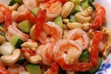 主料:虾肉300克,腰果50克,辅料:黄瓜50克,葱末15克,姜末5克,蒜米10克,高汤10克,湿淀粉20克,鸡蛋1个,干淀粉,调料:白糖10克,料酒5克,盐3克,味精2克,清油各适量。