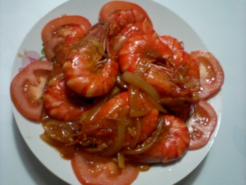 主料:大虾10只,大葱1个,蒜茸1汤匙,姜茸1汤匙,番茄1个
