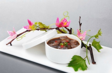 该菜品属孔府宴顶级大菜,后结合粤式烹调手法,成形特别美观,立体感强,使人食欲大增。