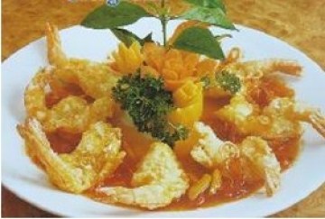 1、大虾去头、壳、虾肠,留下虾尾,洗净、沥干水分,用刀开成虾球形,再轻拍,加入腌料拌匀,扑上生粉,下热油锅炸熟,沥干油分,上碟。