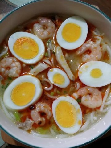 5、最后放入虾仁再次煮开,放些盐、胡椒粉、淋上香油即可出锅装碗,撒上香葱,放上香辣酱,摆上鸡蛋片即可享用!香辣美味的米线,太好吃啦!