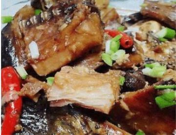 5.闷至水干即可。如果鱼块事先没泡而很干又硬的话,在上一步烧开后,盛入盆中置入高压锅20分钟也可,我以前都是这么做的,味道也非常的好。