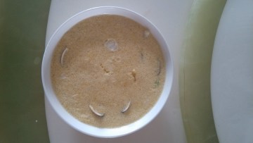 步骤1:文蛤超市买回来的时候,要用水泡一下。泡文蛤的水里面放一勺炒菜用的油,把油搅匀,使油花儿均匀的分布在水的上面,最多一个小时吧,沙子就吐得干干净净了。文蛤蒸蛋很好吃,但是有时每次蒸出来的文蛤口子有不少都是闭口的。建议你蒸之前用刀把文蛤从中间切一下,不要分开,切一下切到不能闭口蒸就行了。