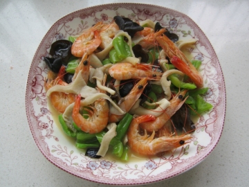 第一种:海鲜菜谱青椒木耳平菇虾做法