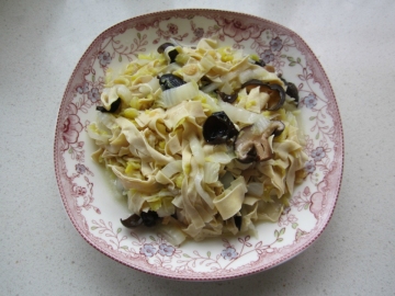 2、白菜洗净切丝,百叶切丝,木耳泡发。
