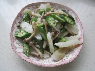 秋葵6个,山药200克,海鲜菇100克,油、盐、鸡精适量。
