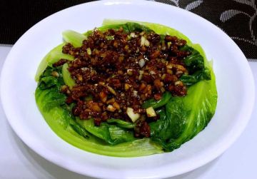 4、净锅放少许底油,油热后下蒜葱末爆香,加虾末肉末,加蚝油、白糖、酱油,勾薄薄一层水淀粉烧开后淋在生菜上即可。