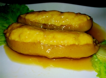 6、将(2)酱汁煮沸,放入海参,改小火煨10分钟,翻面煨烧入味即可勾芡出锅。(酿入肉馅的面朝下)