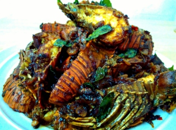 虾婆1kg,虾米干30g,马来盏5g,红辣椒1条,咖喱叶6束,蒜头5瓣,小葱头5粒,咖喱粉1/2汤匙,蚝油3汤匙,糖1茶匙