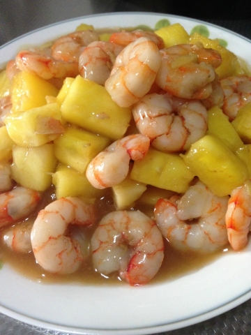 3、干锅烧热,放入虾仁、菠萝及c料拌匀即可。