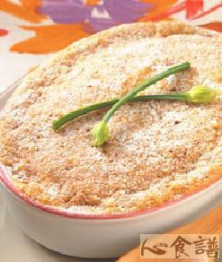 2.制作布丁馅:将材料3的奶水煮至90℃备用;再将鸡蛋、砂糖、低筋面粉及玉米粉拌匀后,沖入加热过的奶水,以隔水加热的方式继续煮至胶凝状后熄火,将奶油加入拌匀即可。