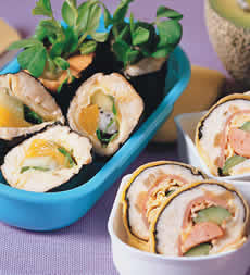 (6)另一卷水果寿司则依序铺上海苔片、双面涂上千岛酱的土司片、蛋皮、再将萝卜婴(可突出寿司卷外)、水蜜桃条、哈密瓜条、火龙果条成直线排放在蛋皮中央,再依照作法3捲成圆筒状。