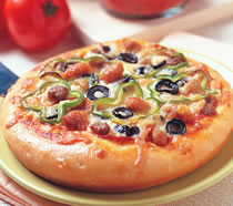 厚皮披萨面皮1片,蕃茄酱汁适量,美式沙拉米12片,义大利小丸20g,小猪肉丸20g,小牛肉丸20g,黑橄榄15g,洋葱20g,玛兹拉起司120g