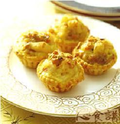 (4)将馅料平均放在模型上,并刷上蛋黄液,撒上起司粉,烤箱加温至250℃,将海鲜芝士盏放入烤约15∼20分钟,至表皮金黄即可。