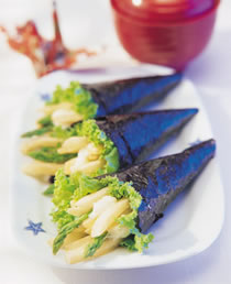 (3)取1张三角形海苔片铺平,再将生菜叶放入中间,再依序放入薯条、芦笋、沙拉酱、白芝麻等。包法是从左边捲至右边,要注意必须将中间材料捲紧,海苔边塞入尾端后,再把另一边的海苔从右捲至左,然后放入盘子中或是手卷架上,全部做好即可食用。手卷内的材料及份量可以自行调