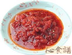 3.将炒好的红酱稍加冷却,然后搅拌机中打碎,然后再倒回到锅中,煮滚后红酱就做好了,将它倒入容器内一会使用。
