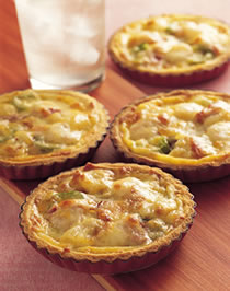 3.每个塔皮内层先刷上番茄酱,再洒上起司丝,将配料分别排列于上。