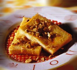 (4)将煎好法式土司各切成2片长方形土司,把切好的土司放入盘中,先淋上枫糖浆,再撒上切碎的综合坚果即可。