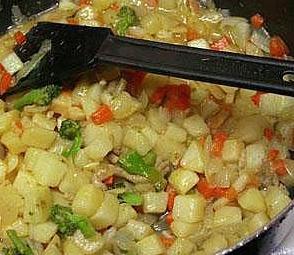 2.用厚底铝锅,置于火上,烧融黄油,然后把葱和蒜下入,炒至洋葱呈透明,把土豆丁加入搅拌几分钟。土豆丁炒到全部挂上油后,加入蔬菜汤,香叶,少许盐、胡椒面、味精、搅拌均匀。如果水少,可以再加一些,但不要太多,约微沸45分钟,要不停地搅拌,勿使其糊底。到土豆熟时(少司也变稠了)。再放些植物油和酒,混合好即可,装盘时撒上一些芹菜末。